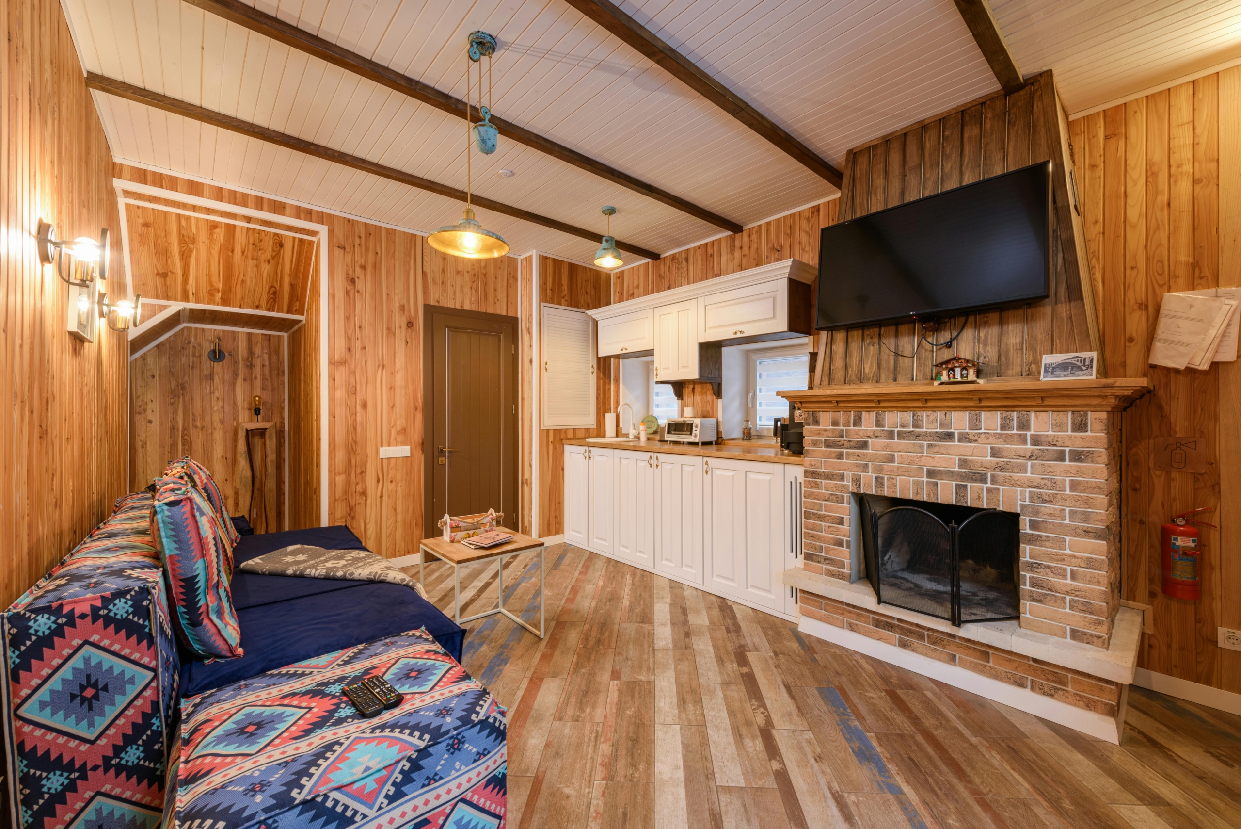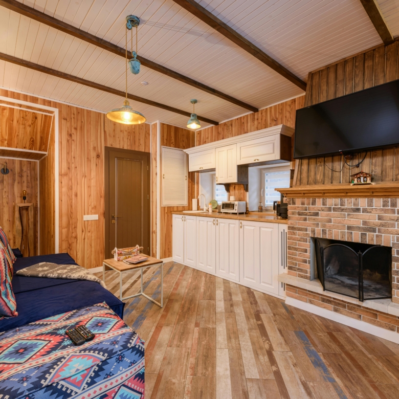 Grand séjour lumineux avec poutres apparentes et cheminée